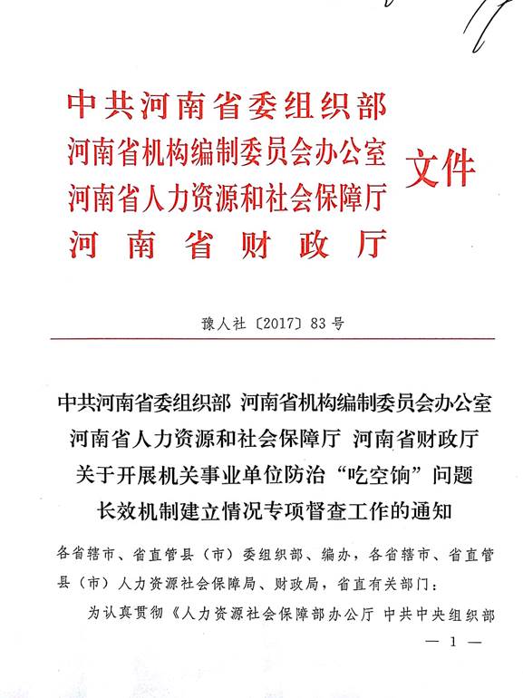 现将省委组织部、省编办、省人社厅、省财政厅《关于开展机关事业单位防治“吃空饷”问题长效机制建立情况专项督查工作的通知》(豫人社[2017]83号)转发你们,请按通知要求,开展全面自查。形成自查报告,纸质和电子版于10月12日下午17:00前报省教育厅,我厅汇总后统一报省人社厅。