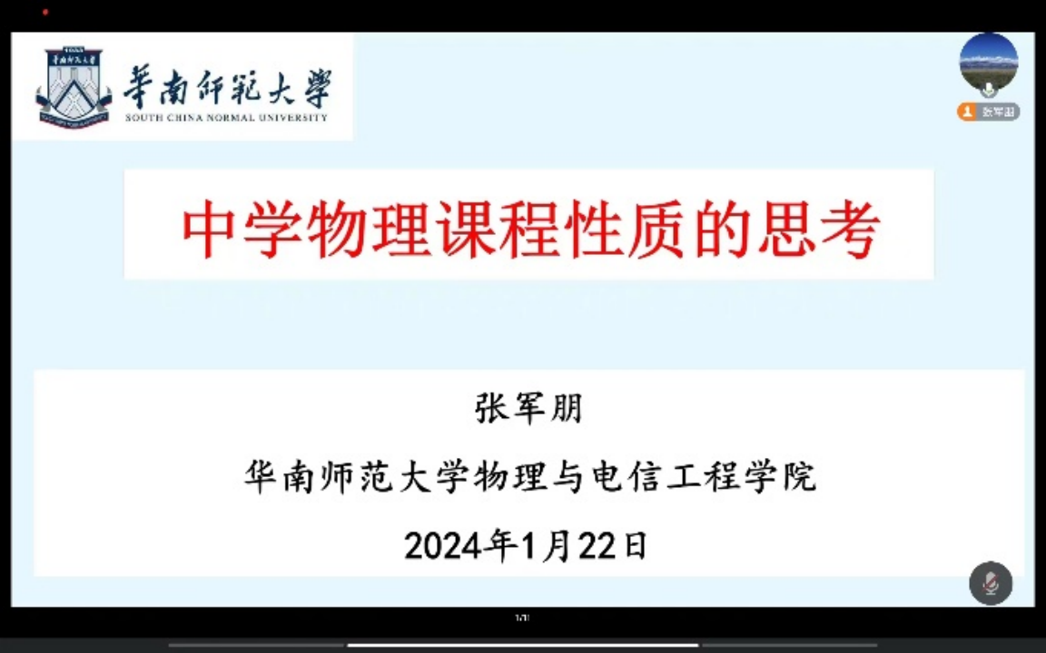 1月22日,由华南师范大学张军朋教授作题为《关于中学物理课程性质的思考》主题报告,会议由忻州师范公司王清亮老师主持。会上,张教授从课程性质指的是什么、如何审视物理课程性质、从课标看物理课程性质、从课程实践看物理课程性质四个方面具体展开,从学科视角、培养人的视角指出,物理课程应体现和反映物理学作为自然科学的本质特征,物理课程应体现和反映多维度、多因素和多学科的相关性的特征。课程标准从学科属性和教育属性阐述了物理课程的性质,结合课程实践指出物理课程的五个维度。