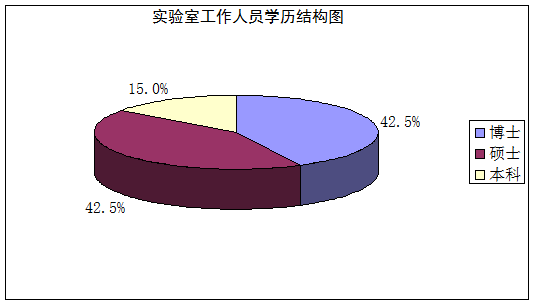 太阳成tyc7111cc官网非常重视实验室的管理工作,由陈文聪经理担任领导组组长,副经理李朋博士担任主管经理,麻焕锋博士担任主任,杜雪莲博士担任副主任。成立了实验室安全工作领导组,组长由经理陈文聪担任,工作组成员有陈文聪、李朋、麻焕锋、杜雪莲、刘红兵、陈青清。为强化实验室的管理,各个实验分室都有专人负责。实验教师和实验室管理人员共有66人,其中教授6人,副教授14人,讲师38人,初级职称成员8人,具有高级职称者占中心人员的33%;拥有博士学位者30人,硕士学位者28人,博士、硕士教师占实验室人员的85%。实验教师职称结构合理,学历状况理想,专业覆盖面宽,学缘结构广,年龄梯次优化。实验室工作人员职称和学历结构如下图。实验室还制订了完善的规章制度,如《实验室工作人员守则》、《仪器设备损坏赔偿制度》、《实验室开放管理规定》等20多项。