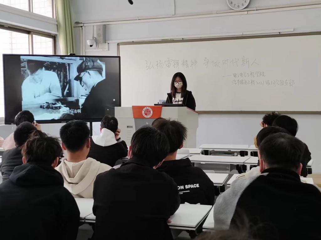 活动伊始,各团支部书记播放电影《雷锋》,重温助人为乐故事,让青年团员对雷锋的生平事迹和人物形象有更加清晰的了解。同时,宣讲雷锋精神,传承红色基因,讨论在新时代如何践行雷锋精神,号召青年团员学习雷锋好榜样,争做雷锋接班人。最后,活动在歌曲《学习雷锋好榜样》中结束。