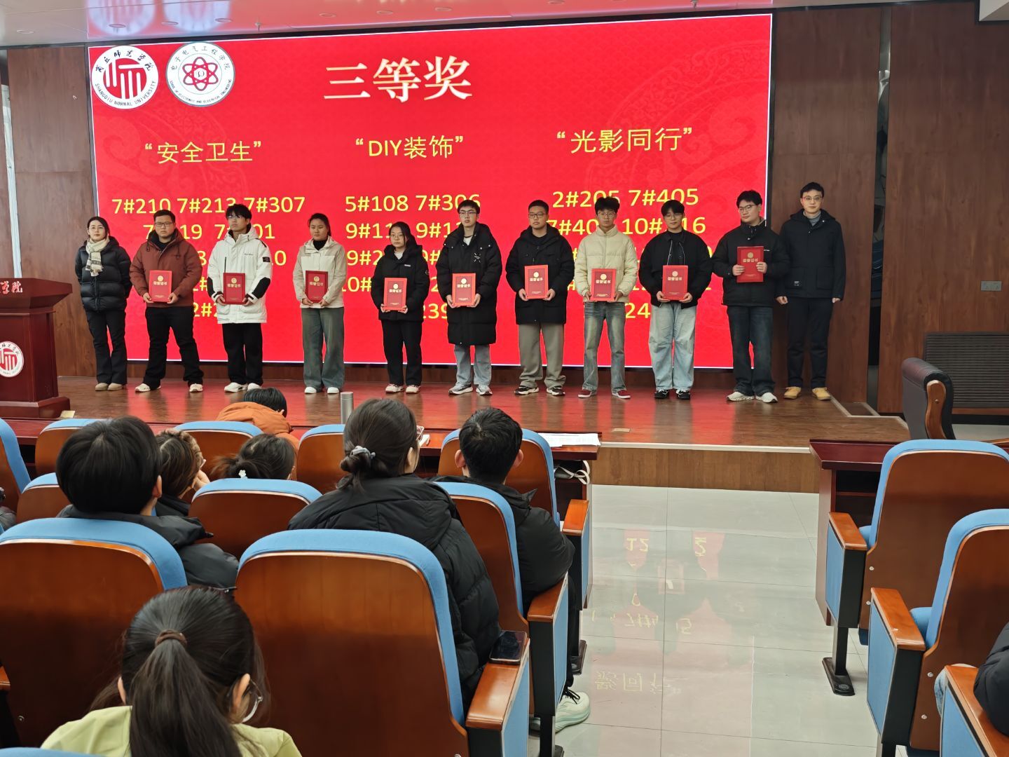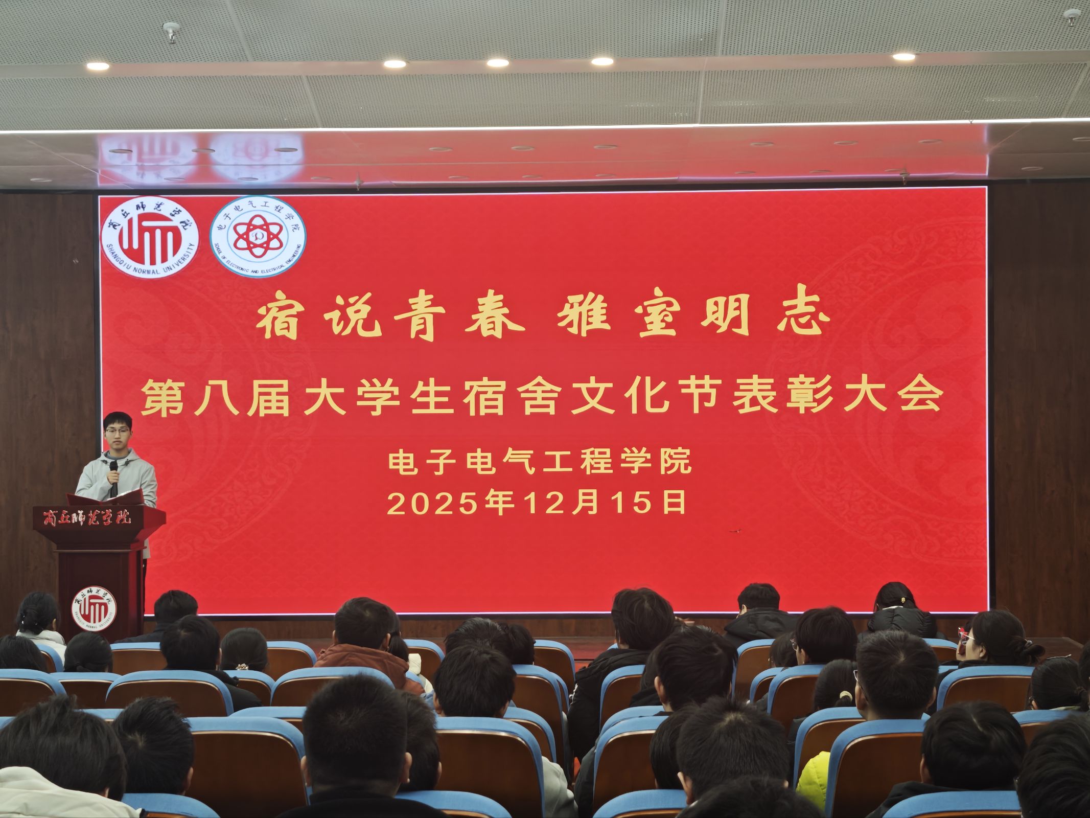 12 月 15 日,公司在工科实训楼报告厅举行“宿说青春,雅室明志”第八届老员工宿舍文化节表彰大会。公司党委副书记蒋玉涛、学工办主任孙莉娟、副科级组织员王兴及辅导员郑敏、王灿祥参会。