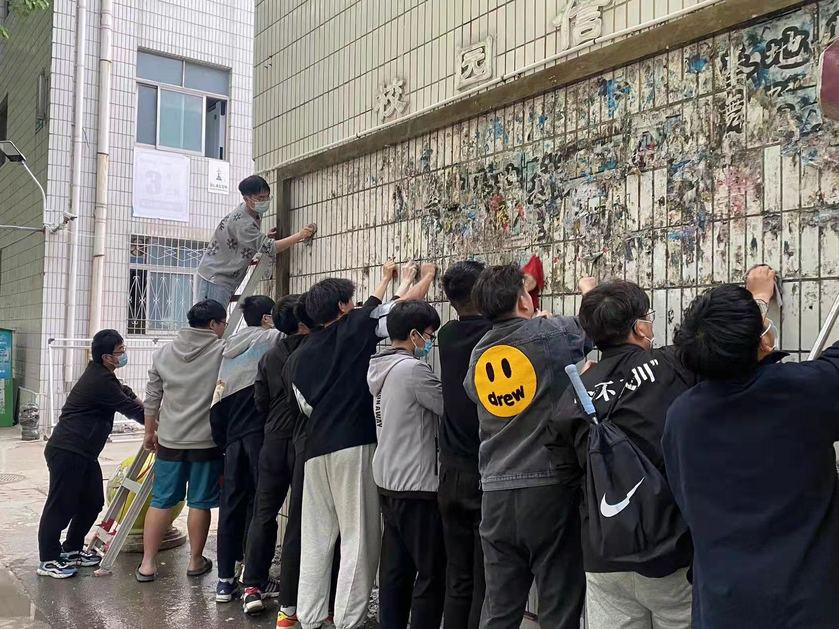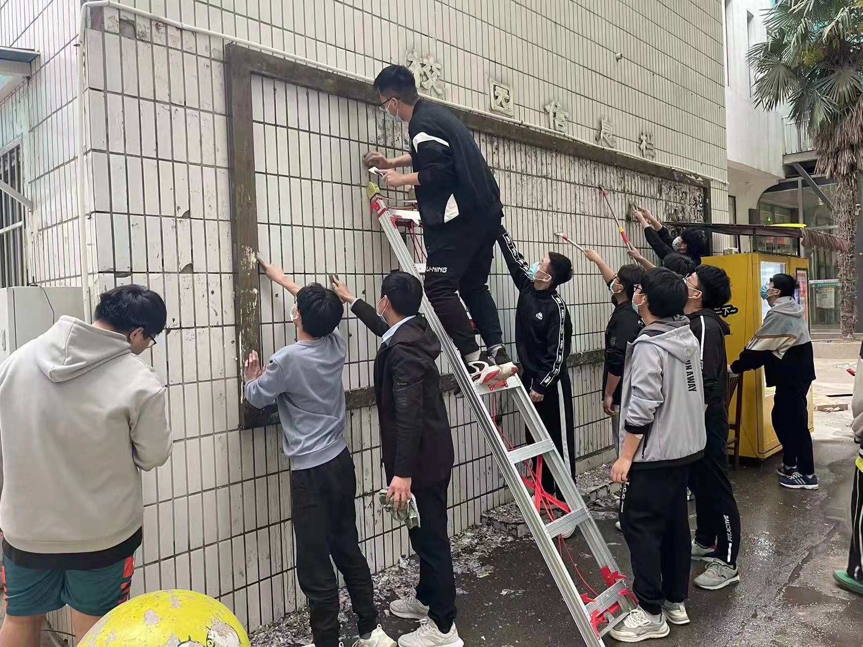 宿舍楼下的宣传栏常年粘贴宣传单页且无人清理,十分影响校容校貌。为此,本次实践活动的主要任务是清理校园里“牛皮癣”式的宣传栏,2021级员工在辅导员陈玉昊老师的带领下,踊跃参与积极行动。活动中同学们配合默契、分工明确,各司其职,不怕苦不喊累,用抹布和刮刀一点一点的清理,一块一块的擦拭,让原本“灰头土脸”的宣传栏逐步露出了“干净洁白的面容”,成为校园一道靓丽的风景线。