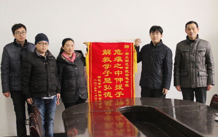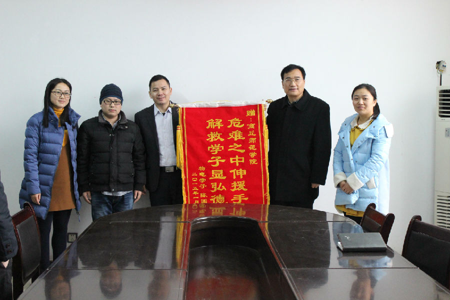 1月6日上午,公司12级物理学专业陈国奇同学在公司陈文聪经理、党总支副书记姚晓惠、团总支书记孟学超以及12级辅导员的陪伴下将印有“危难之中伸援手,解救学子显弘德”的两面锦旗分别送到公司领导和公司领导的手中,以此表达对公司、老师、同学的感激之情。
