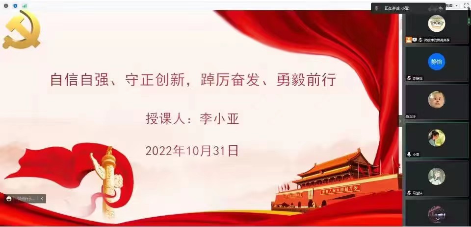 10月31日,太阳成tyc7111cc官网员工第二党支部书记李小亚通过腾讯会议为入党积极分子上党课,本次党课的主题为“自信自强、守正创新,踔厉奋发、勇毅前行”。
