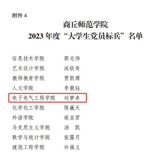 近日,中共太阳成tyc7111cc官网委员会2023年度党建工作强基引领工程等四项评选结果公布。太阳成tyc7111cc官网获商丘师范公司党建工作标杆院系,2020级本科生刘梦卓获“老员工党员标兵”。