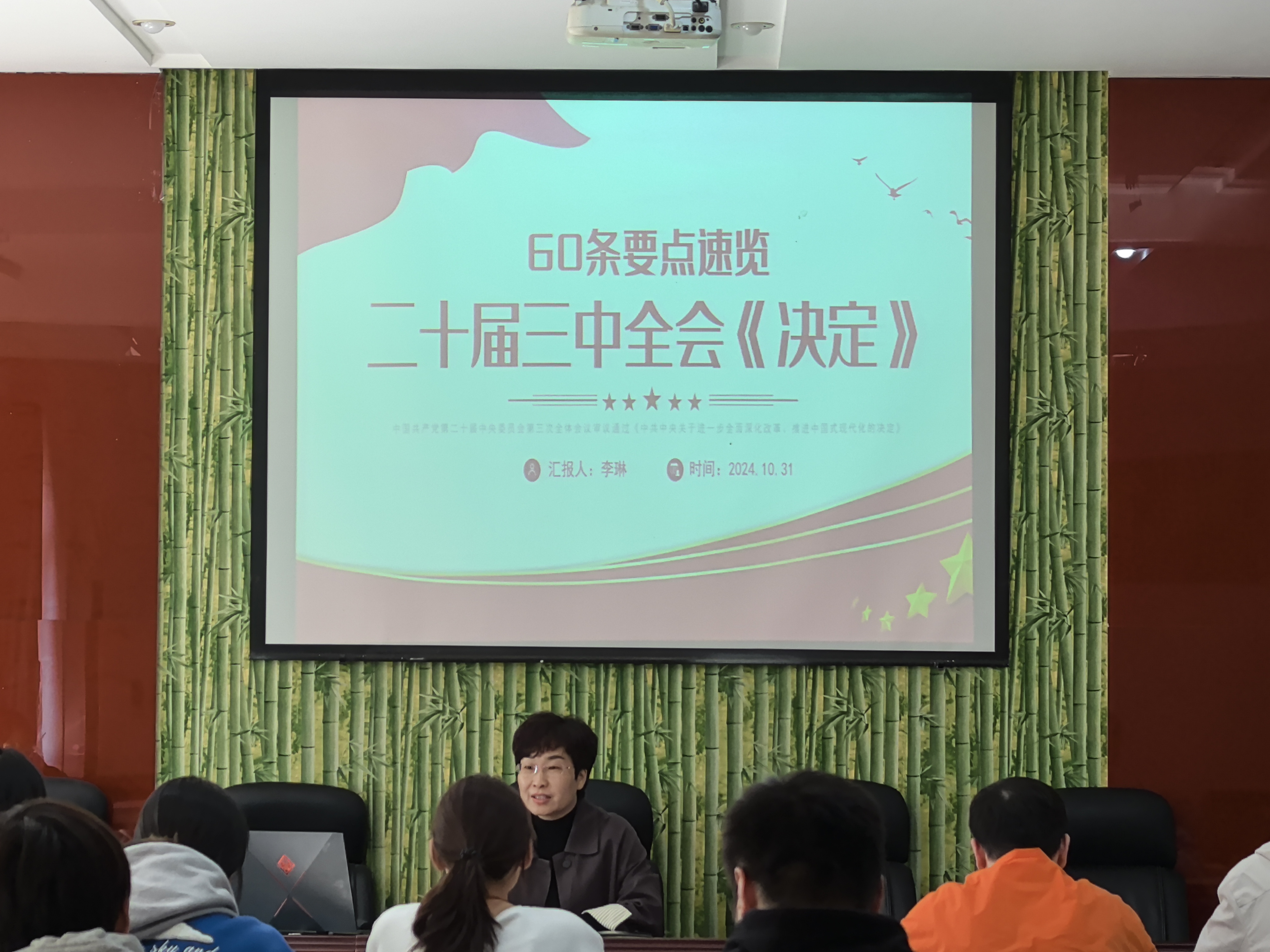 10月31日,公司党委书记李琳在物理楼208会议室为入党积极分子上党课,本次党课的主题为深入学习党的二十届三中全会《中共中央关于进一步全面深化改革、推进中国式现代化的决定》。