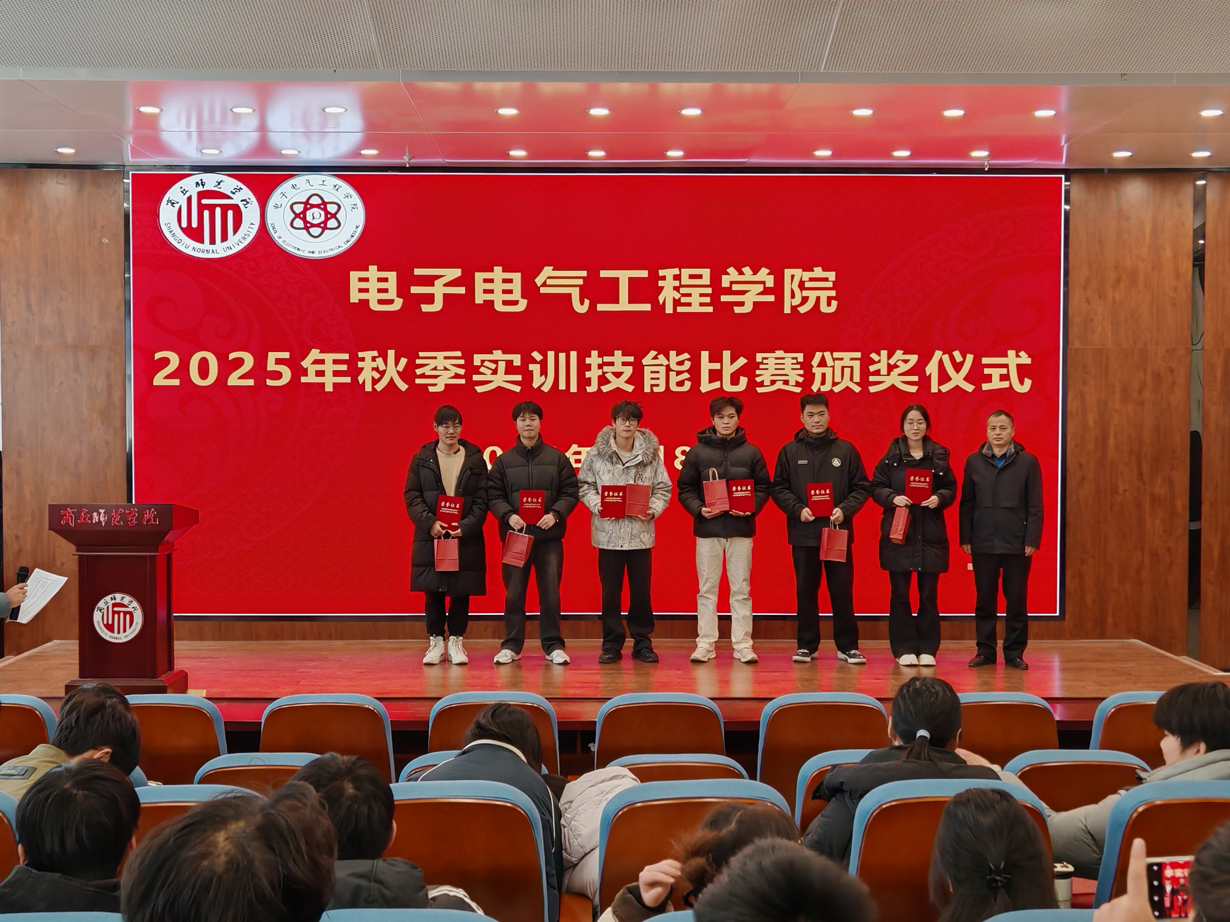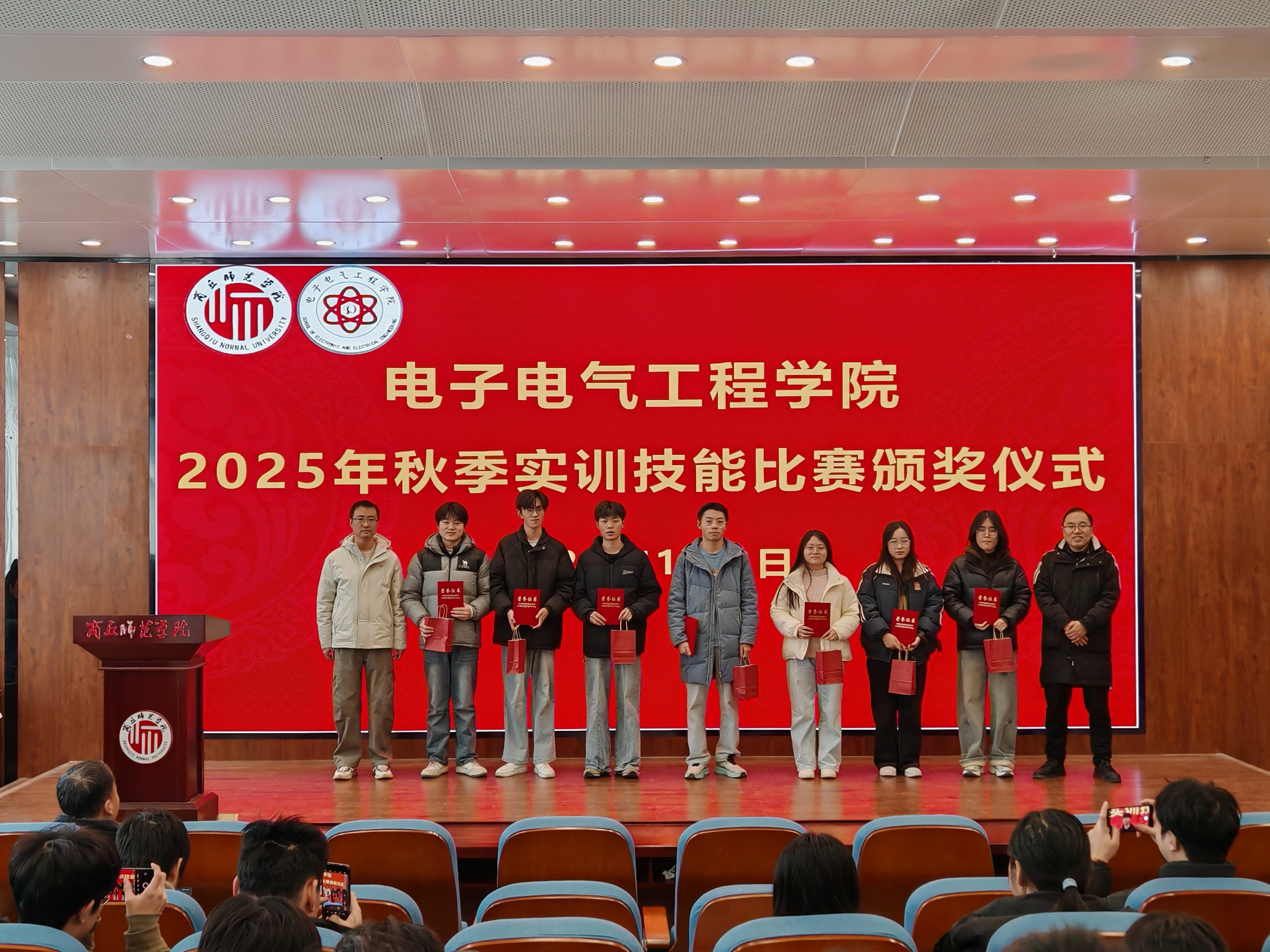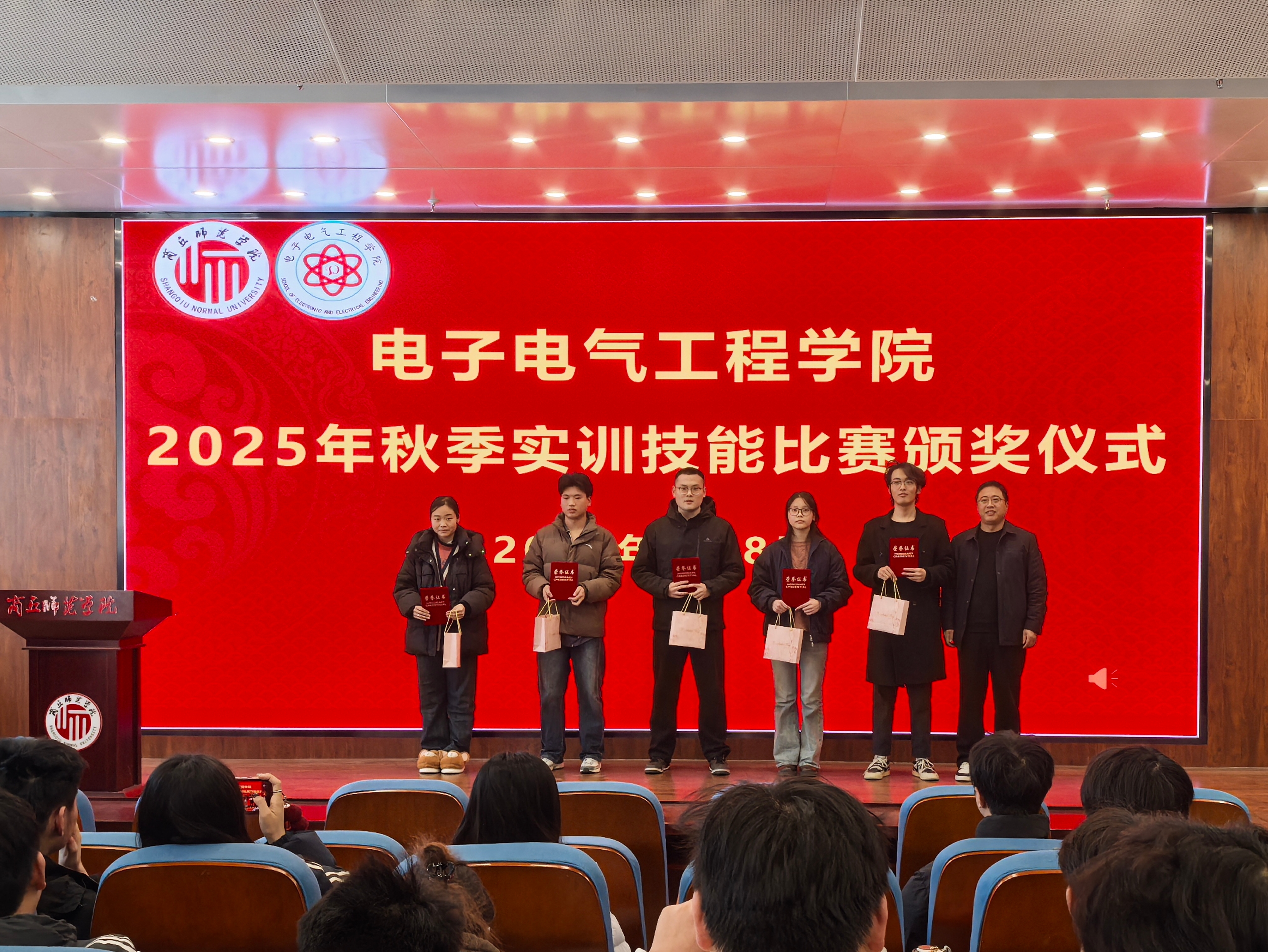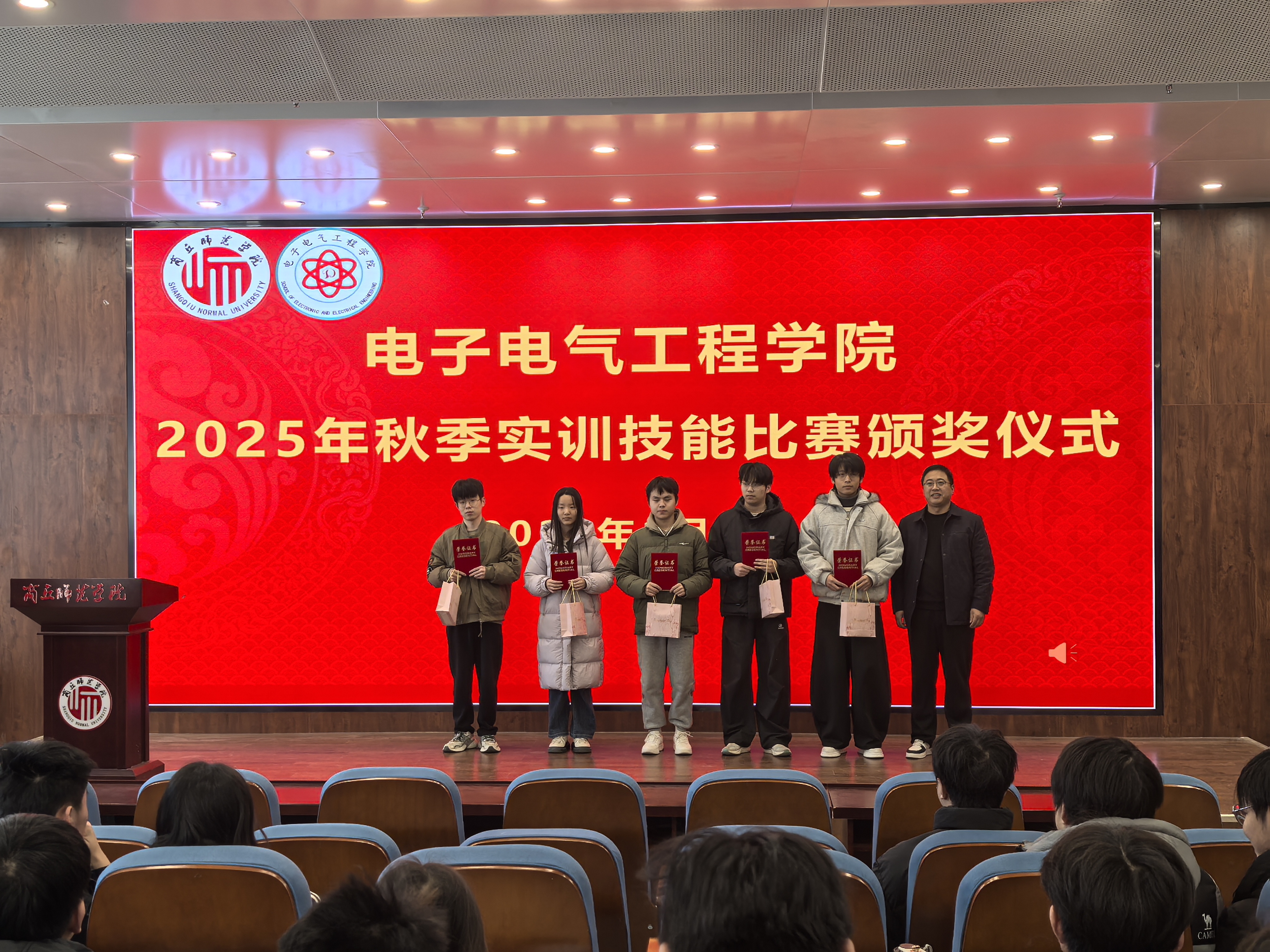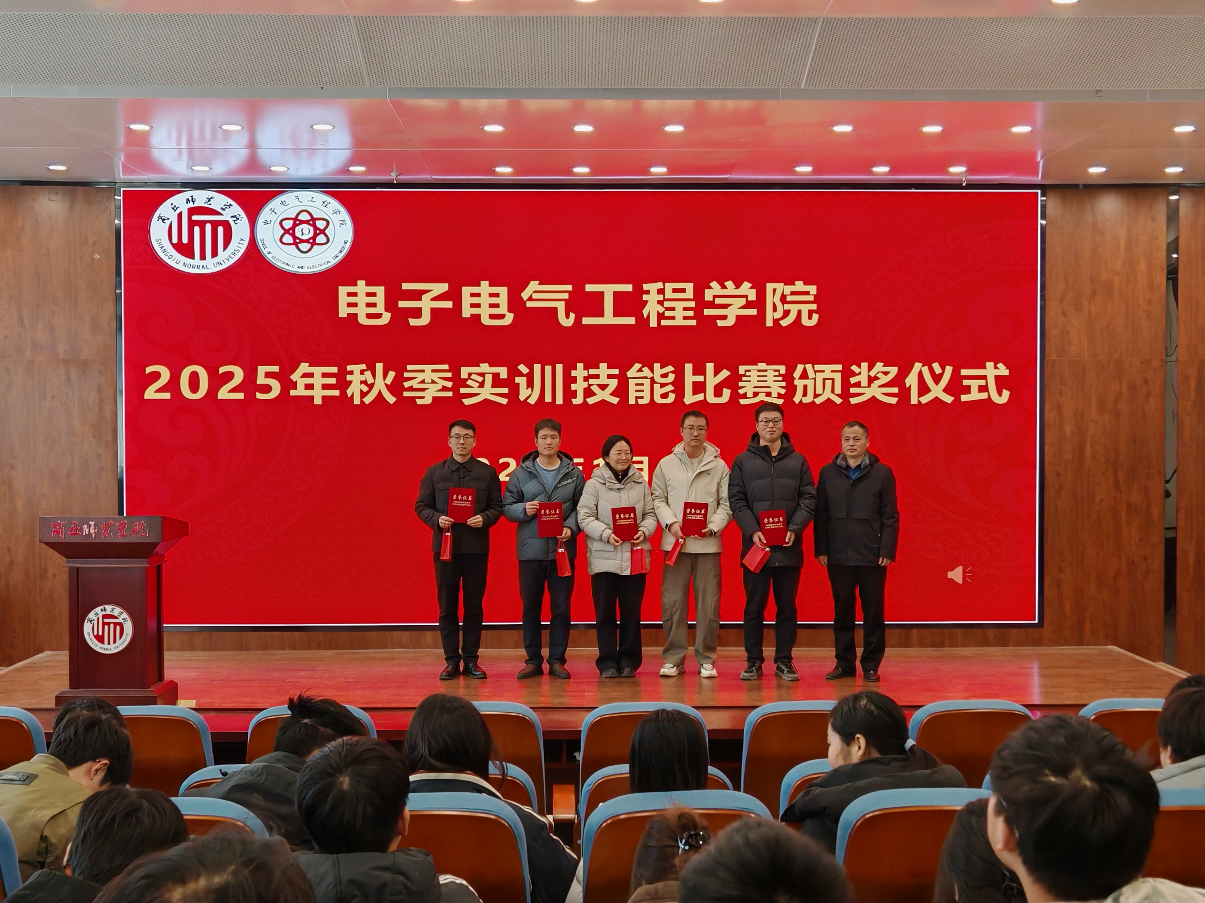 赛后,颁奖仪式在工科实训大楼报告厅举行,由副经理杨同辉主持。仪式上,评审组组长孙春志老师宣读获奖名单,与会领导及老师为获奖选手和优秀指导教师颁发了荣誉证书与奖品。
