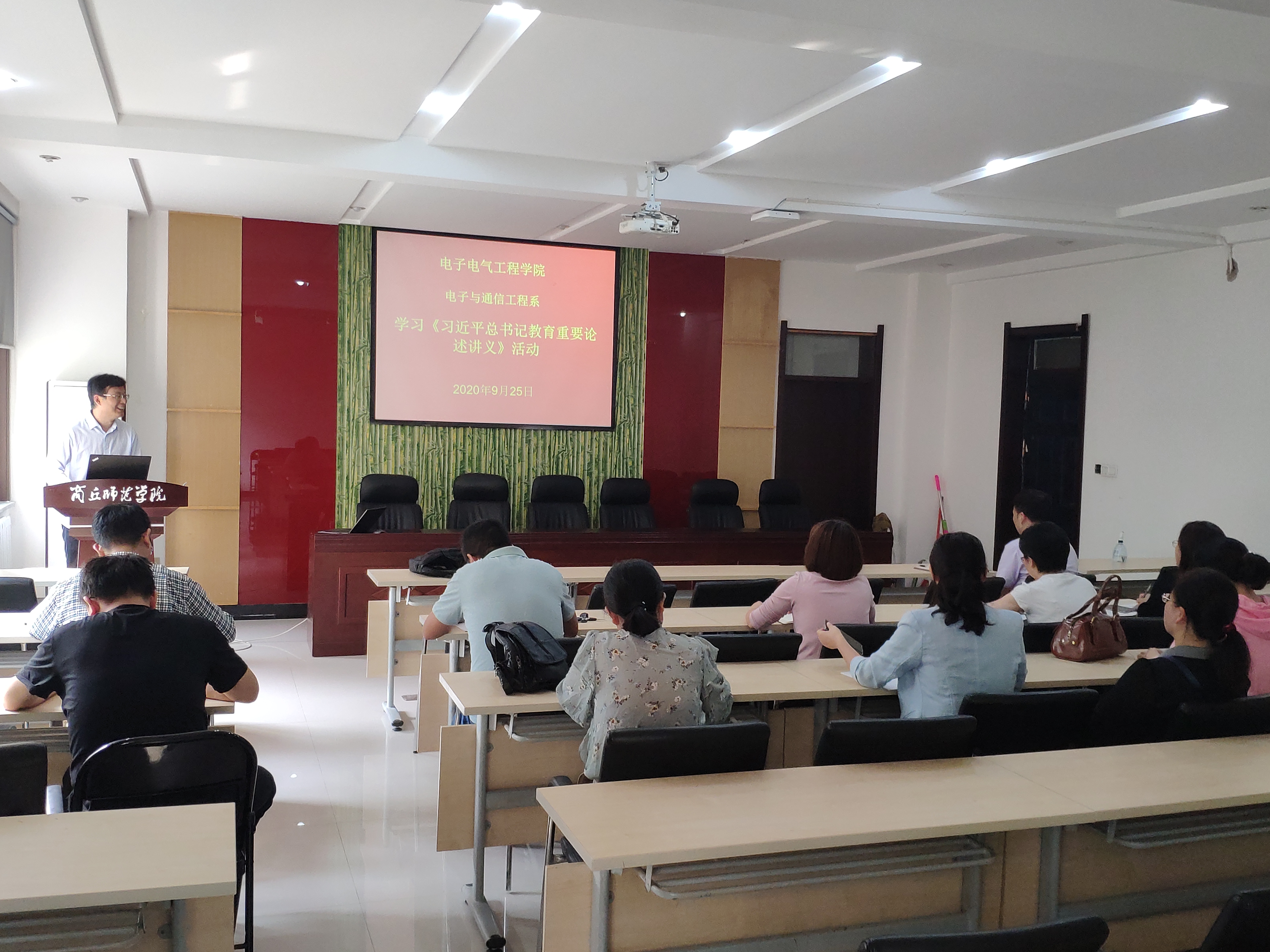 根据公司学习贯彻落实《习近平总书记教育重要论述讲义》的统一部署,公司党总支于2020年9月25日以学系为单位组织教师开展集中学习《习近平总书记教育重要论述讲义》活动,并结合课程思政建设进行了研讨。