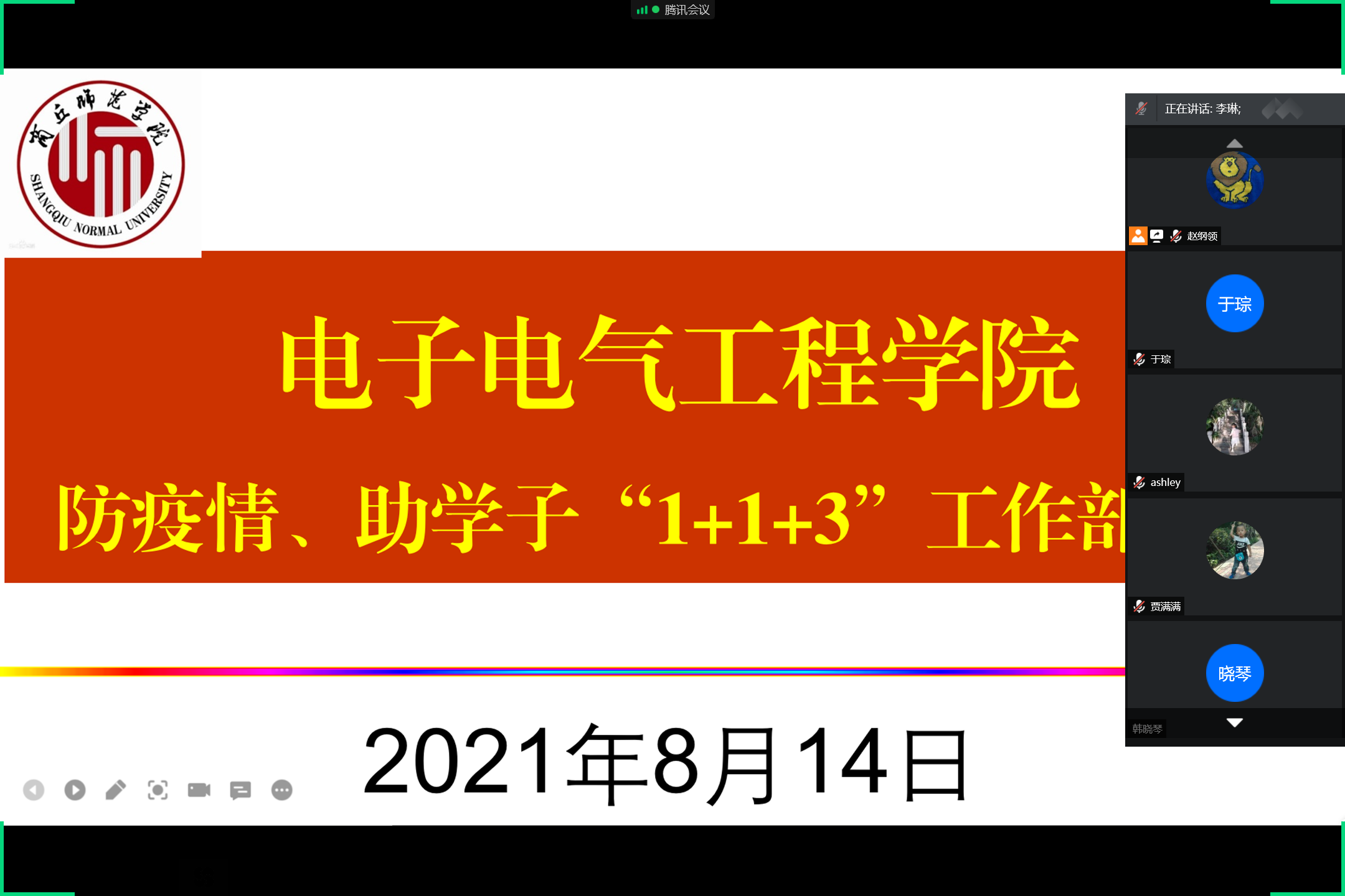 8月14日,太阳成tyc7111cc官网通过线上方式召开防疫情、助学子“1+1+3”工作部署会,公司党委书记李琳、经理赵纲领、副书记蒋玉涛、副经理曾庆国出席会议、各支部书记、各系主任、办公室主任、学工办主任、全体辅导员和班主任参加会议。会议由赵纲领主持。