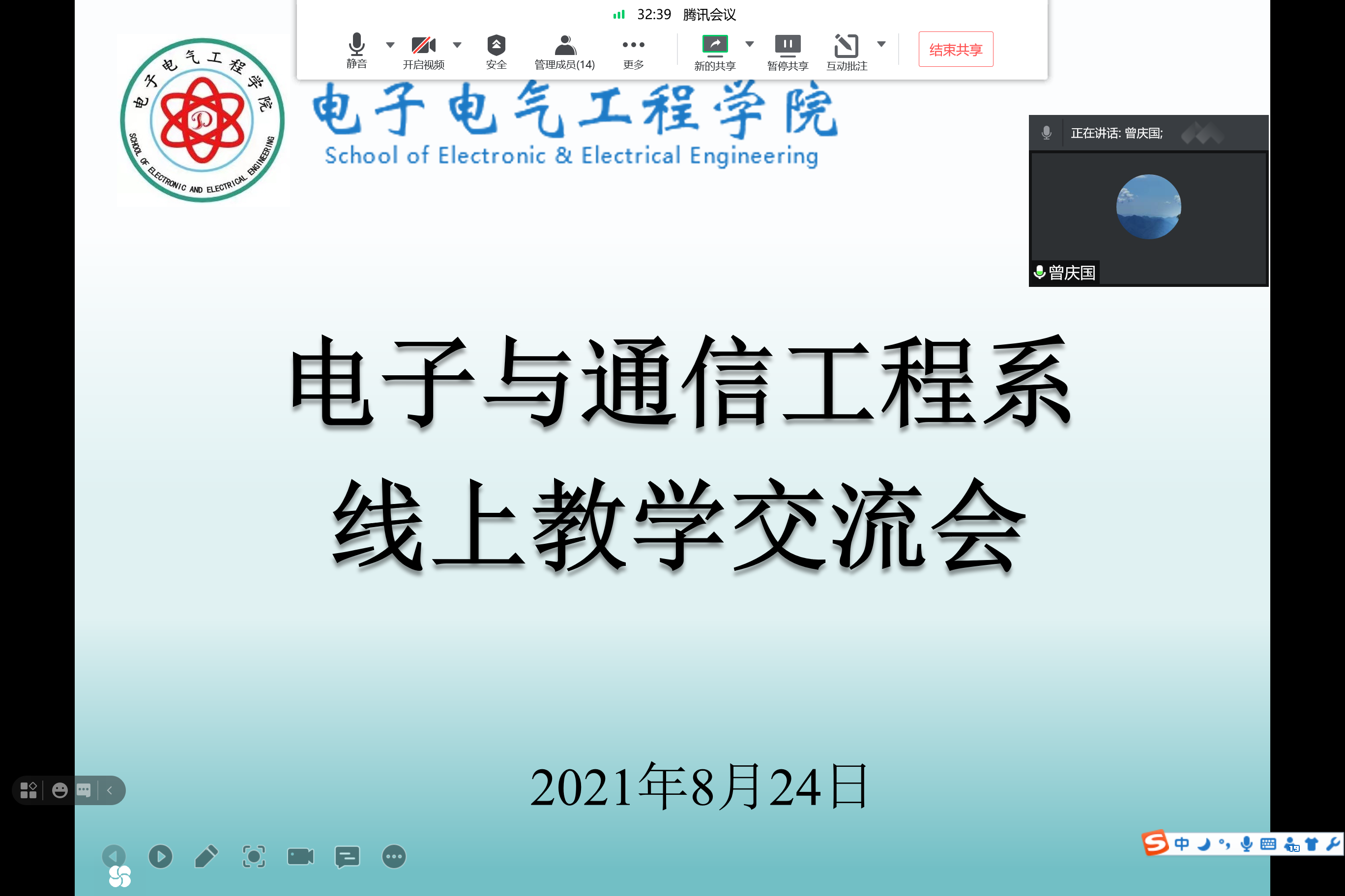 为迎接新学期的到来,高质量完成新学期教学任务,8月24日上午,电子与通信工程系举行了“线上教学交流”视频会议,电子与通信工程系全体教师参会。