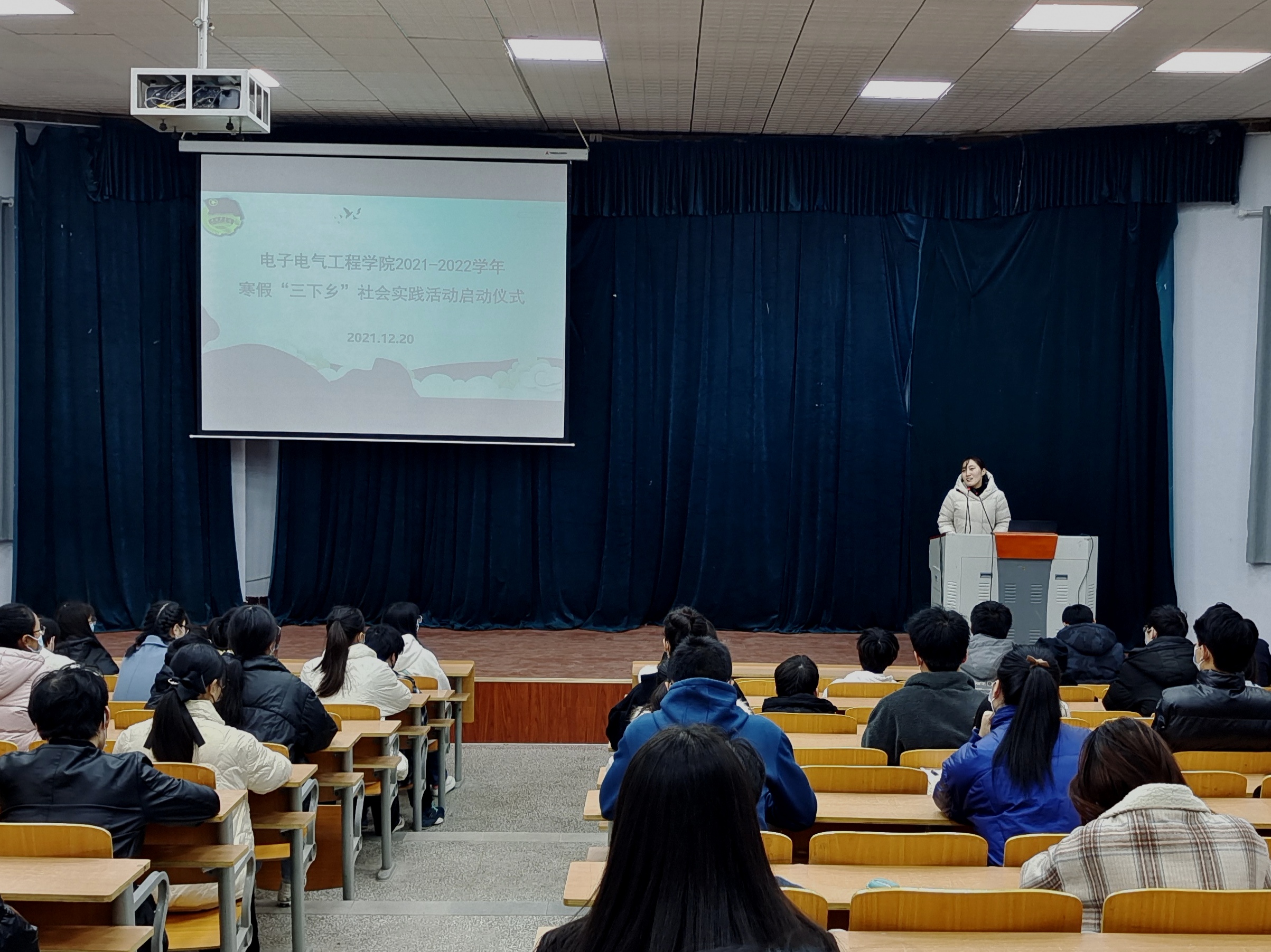 活动在庄严的国歌中拉开序幕。员工会主席团成员赵锦蓉对2021年“暑期三下乡”进行总结发言。2019级辅导员张佳琪对寒假“三下乡”活动的内容和安排进行详细介绍和部署,她指出本次活动的两个主题分别为“践行十九届六中全会精神”和“实践请党放心青春誓言”。团支书代表张阳阳带领参会同学宣誓,为本次三下乡活动增添了更多信心。最后,党委副书记蒋玉涛表示“三下乡”活动的意义在于要敢于突破自己,回报家乡,回报社会;强调了活动中的注意事项;告诫每位同学都要时刻做好自身防护,遵守防疫规定,确保身心健康,并预祝本次三下乡活动能够取得圆满成功!