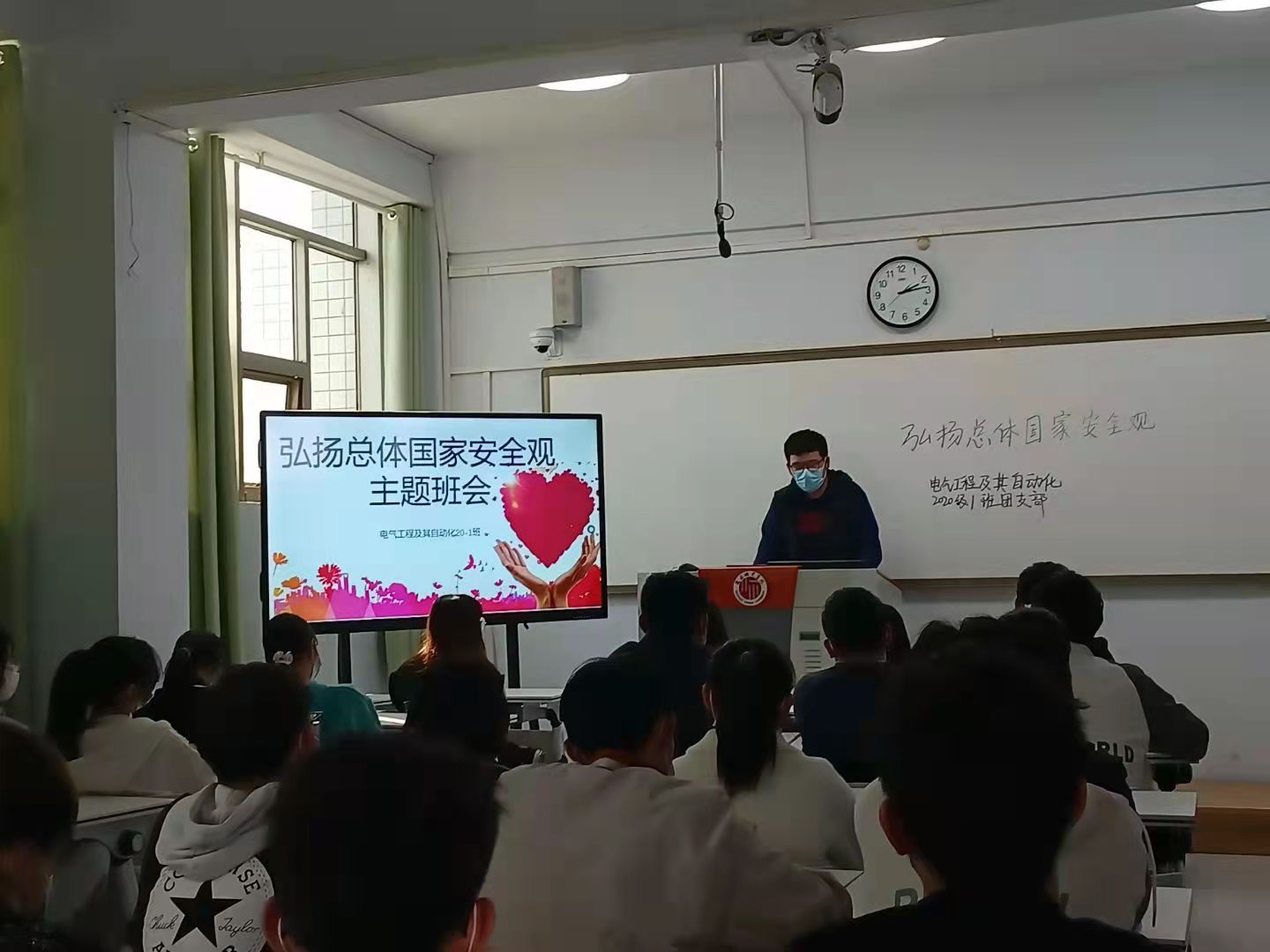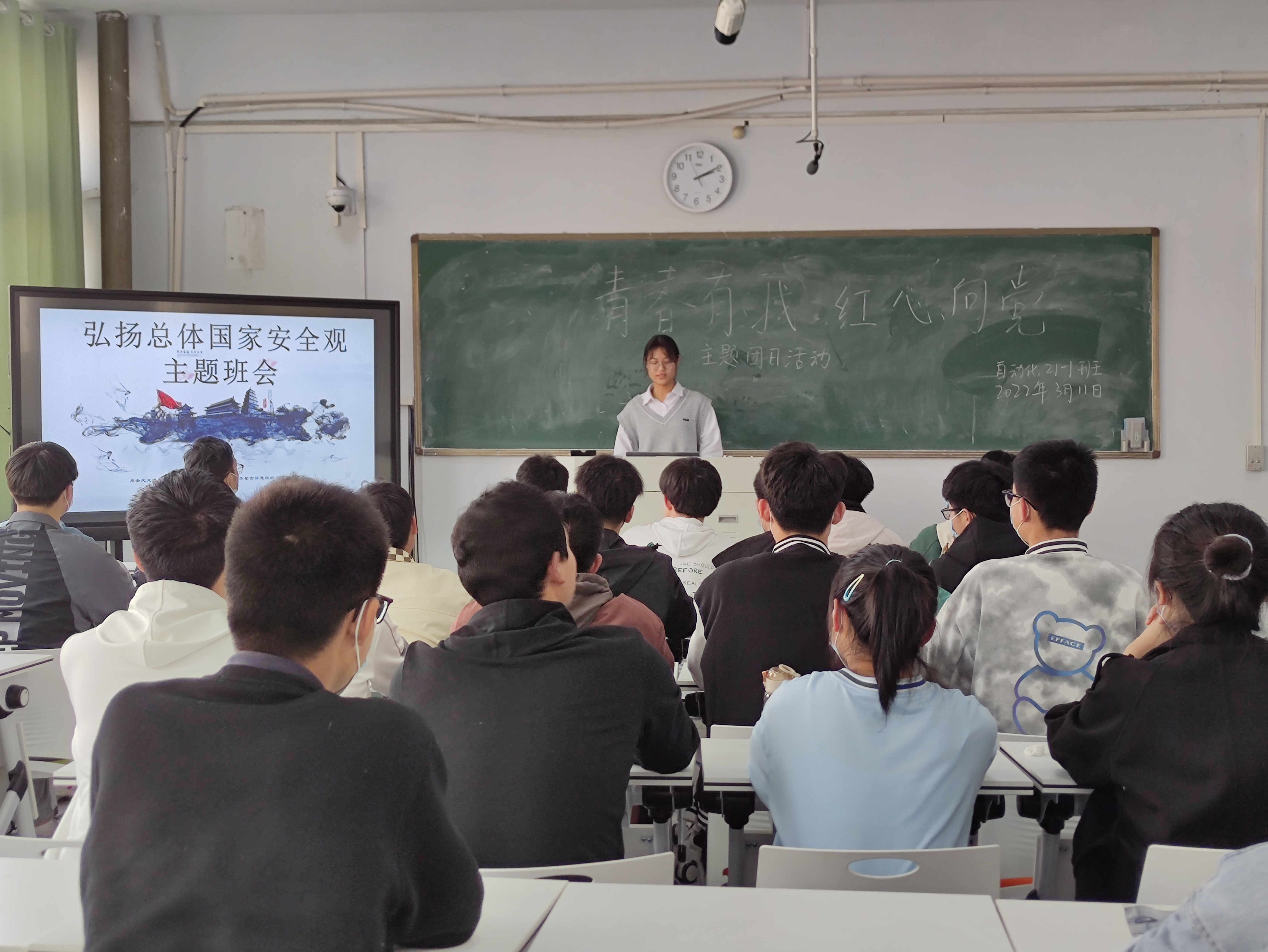 各班团支书从时代宗旨、时代目标、时代脉搏、时代愿景、时代布局五个方面讲述弘扬总体国家安全观的意义,对同学们进行了国家安全意识教育,使同学们意识到“国家兴亡,匹夫有责”。班会引领员工重视国家和民族尊严,激发同学们的爱国热情。接着,同学们通过互动的形式学习了关于总体国家安全观的知识,提高了对国家安全重要性的认识,团支书鼓舞同学们撸起袖子加油干,不忘初心、勇往直前,为国家的发展贡献自己的力量。最后,同学们纷纷表达对本次主题班会的感想,分享自己的心得。