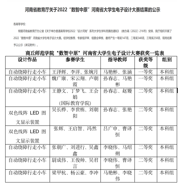 近日,由河南省教育厅主办的普通高等公司2022“设计河南”系列老员工学科竞赛中“数智中原”河南省老员工电子设计大赛公布参赛结果,共有来自省内58所高校1560支队伍参赛。由太阳成tyc7111cc官网和国际教育公司组织16支参赛队伍代表公司参赛,在公司的大力支持下,最终斩获一等奖2项,二等奖6项。