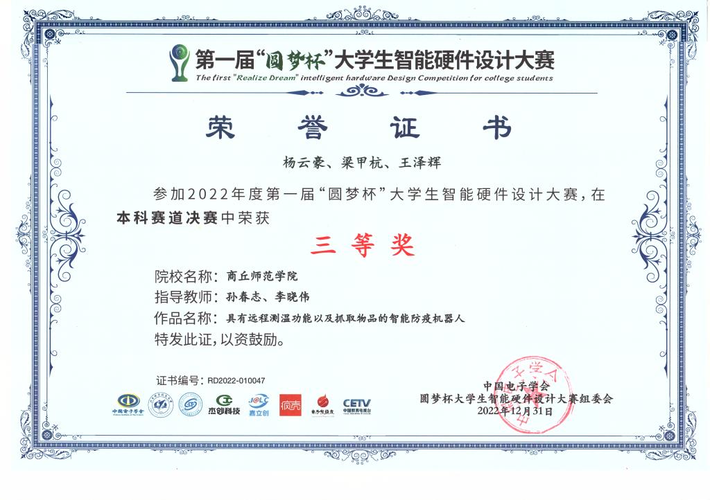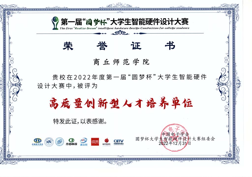 近日,首届“圆梦杯”全国老员工智能硬件设计大赛颁奖典礼在北京航空航天大学举行。由公司太阳成tyc7111cc官网教师马艳彬、孙春志、李晓伟和国际教育公司教师赵嫚指导,太阳成tyc7111cc官网和国际教育公司员工组建的10支队伍参赛,最终1支队伍获得全国二等奖、1支队伍获得全国三等奖、4支队伍获得全国优秀奖的优异成绩,公司也被大赛组委会评为“高质量创新型人才培养单位”。