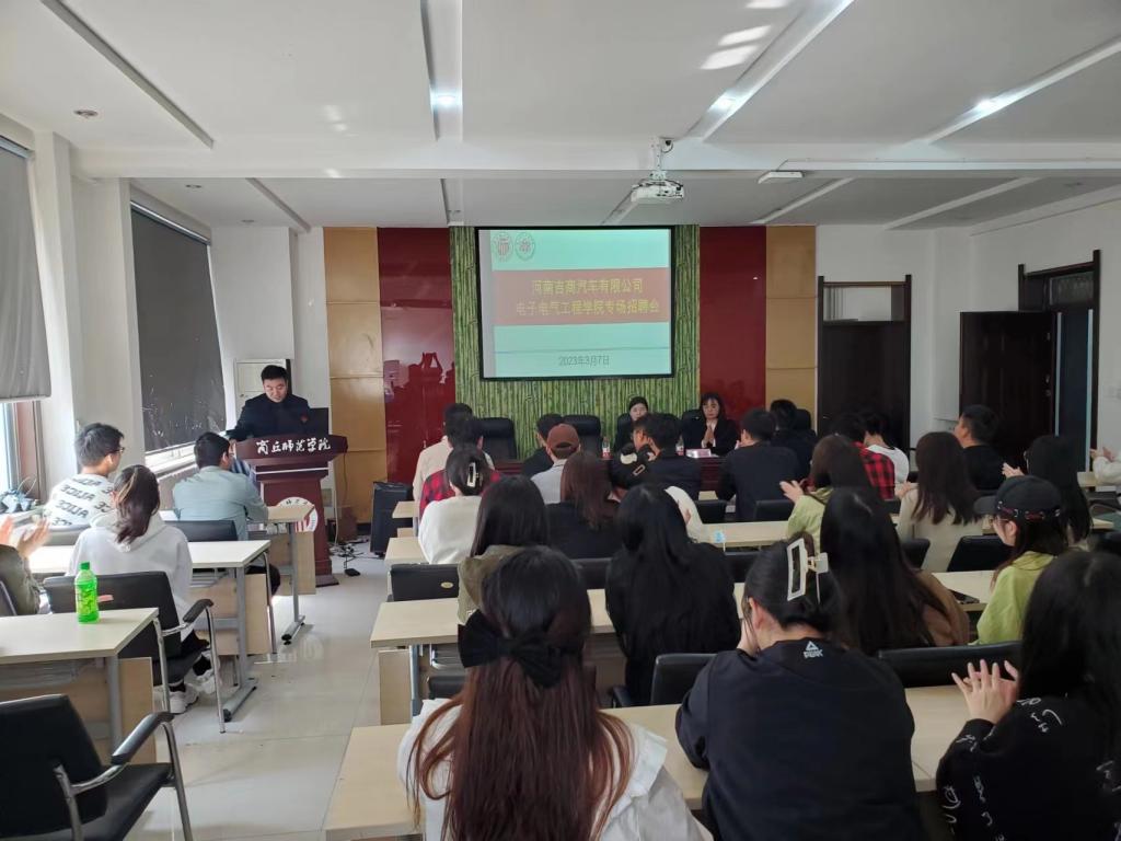 3月7日,河南吉商汽车有限公司在公司睢阳校区物理楼208室召开专场招聘会。公司党委副书记蒋玉涛、河南吉商汽车有限公司市场专员余盼男、绩效专员高端端、毕业班辅导员出席,100余名毕业班员工代表参加会议。