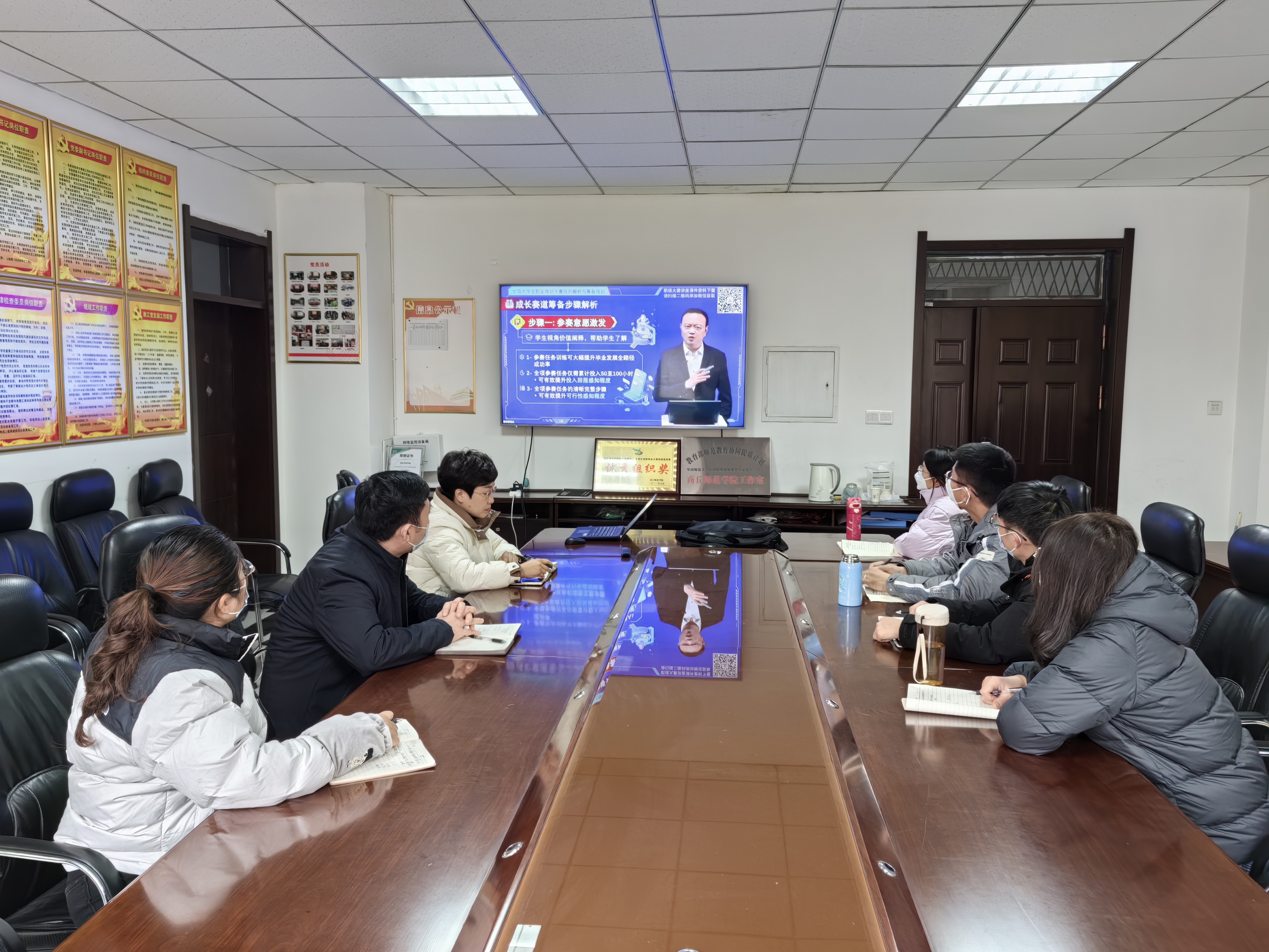 11月29日,公司在睢阳校区组织观看河南省职业规划大赛网络公益直播课,主讲人是万学教育董事长张锐博士。公司党委书记李琳、党委副书记蒋玉涛,全体辅导员老师参与观看。