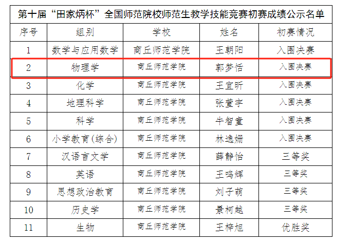 近日,全国师范院校师范生教学技能竞赛组委会公布了“田家炳杯”第十届全国师范院校师范生教学技能大赛初赛结果。公司物理学(全免)22-1班郭梦恬同学入围决赛。本次大赛公司推荐的11名选手在全国1831名参赛选手中脱颖而出全部获奖。最终,共6名选手入围全国决赛。