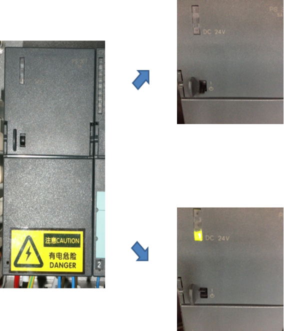 将PS307电源的开关由“关闭”位置,向上拨动至“打开”位置。此时,PS307电源上的DC 24V指示灯应为绿色常亮状态。