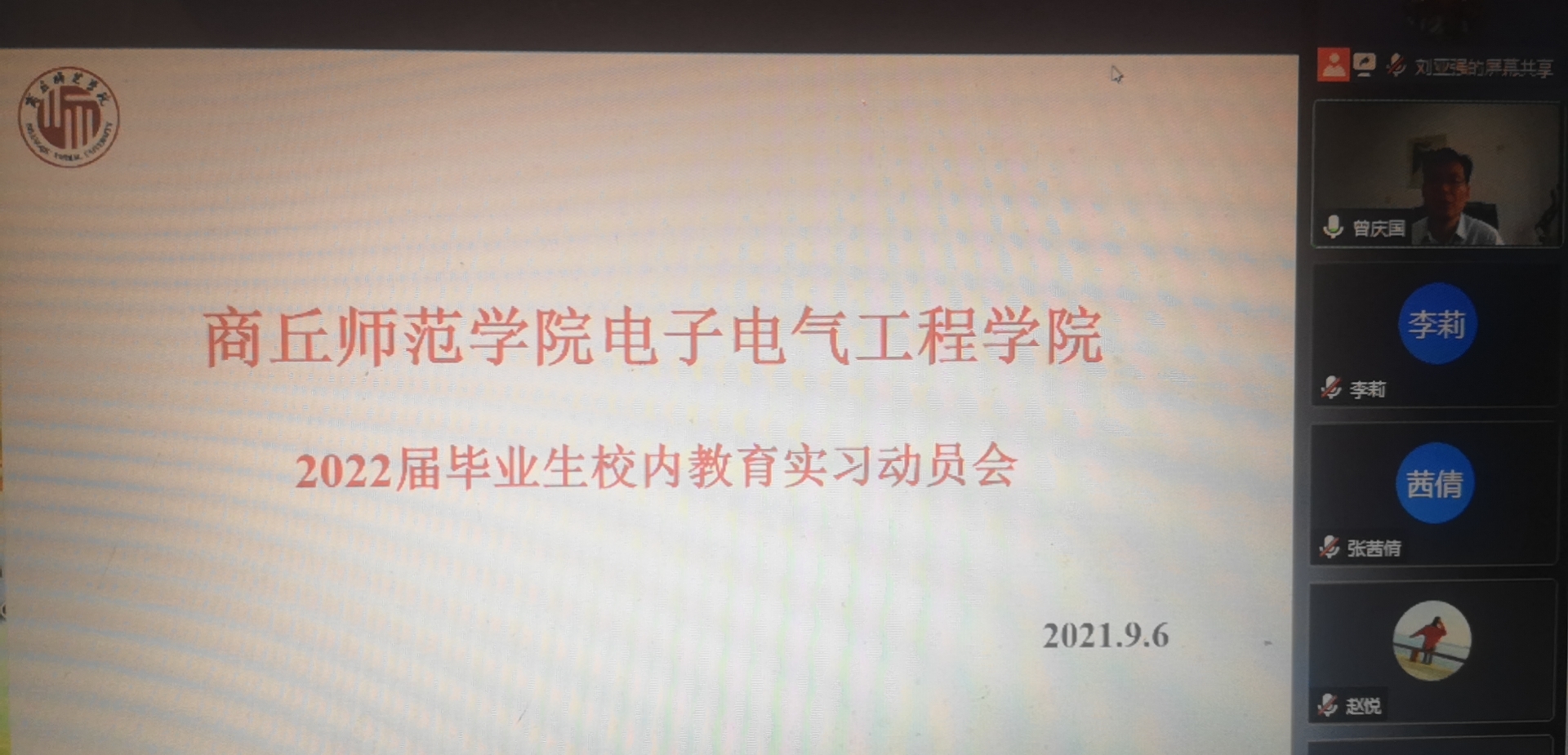9月6日,太阳成tyc7111cc官网召开了2022届毕业生线上教育实习动员会,会议由刘亚强博士主持。副经理曾庆国、校外指导老师张茜倩、实习指导教师李彦敏、刘亚强、李莉、程文静、乔红贞、林可君、欧阳小芳、和2022届物理学专业全体员工参加了动员会。