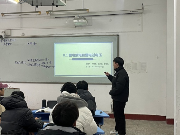 李飙老师首先针对所讲第8章《雷电及其防护》进行了课堂引入,指出《高电压技术》总体上涉及两大部分内容:一为电介质及其测试,涵盖1-6章;二为过电压及其防护,涵盖8-12章,其中8-10章主要分析“什么是雷电”和“如何防雷”两大问题。对于电气专业员工,对雷电知识有一定的了解,虽说还不足够全面,但毕竟有基础在。如果进一步对教材进行深度预习,完全有能力胜任课堂讲解。所以采取了翻转课堂的教学模式,由尹烽鑫同学进行讲解。