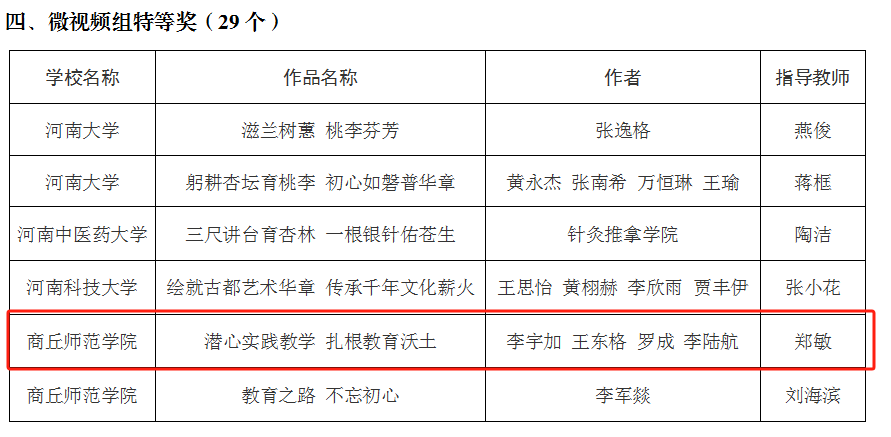 郑敏老师带领员工团队制作的微视频《潜心实践教学 扎根教育沃土》获微视频类校级一等奖、省级特等奖;通信23-1班王素萍、青梦宣传中心成员汽车23-1班罗成分别获得校级征文类二等奖,公司关工委也获得业绩考核二等奖的好成绩。今年3月份,省教育厅关工委“读懂中国”活动实施方案下发以来,公司关工委广泛动员,积极组织,严格把关,前后历时1个多月,完成了作品的策划、采访、撰稿、录制、剪辑等工作。